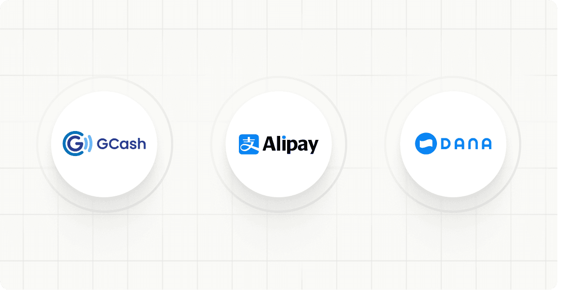Accept payments from over 10 international wallets, including Alipay, GCash, Dana, and more