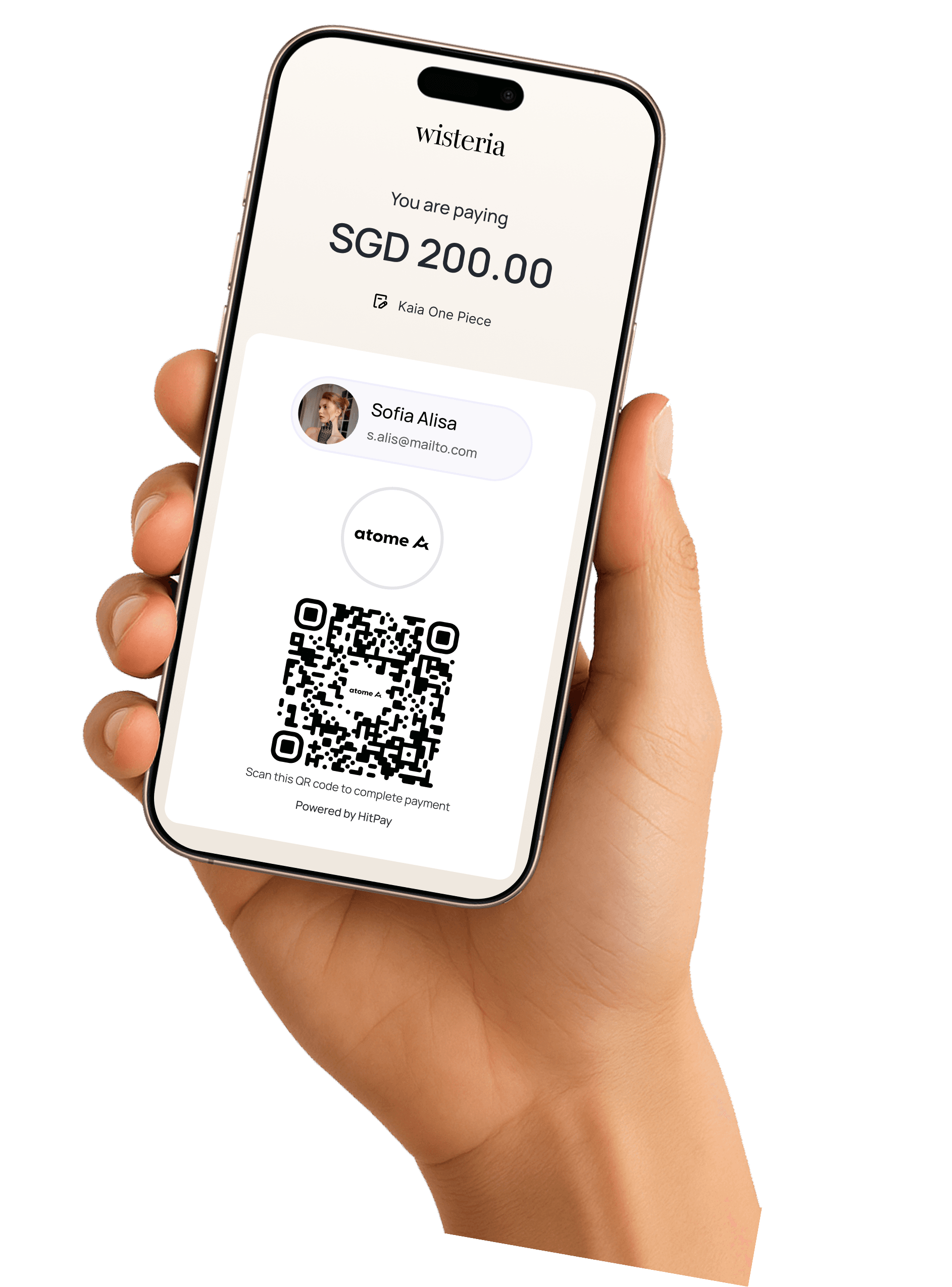Atome QR codes for in-person payments are currently available via HitPay in Singapore and Malaysia.