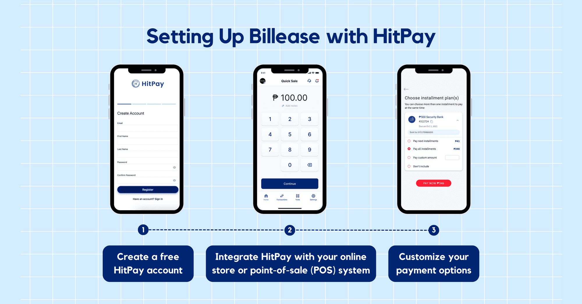 To start accepting BillEase, contact us for a free demo or sign up for free on HitPay's website.
