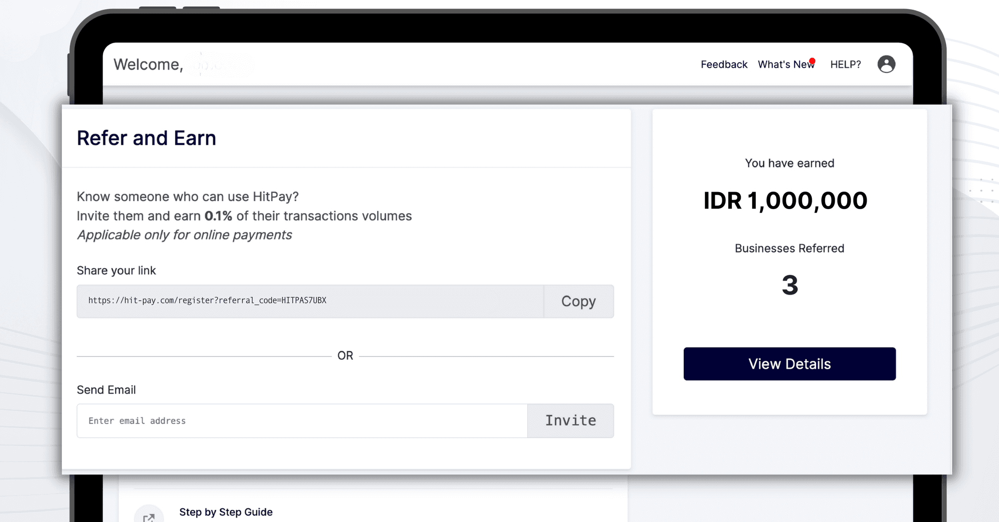 Caranya cukup mudah. Pertama, buka menu "Refer and Earn" di Dasbor HitPay dan bagikan tautan referensi Anda. Dapatkan tautan tersebut dan bagikan kepada teman-teman Anda, atau kirim melalui email kepada mereka yang ingin bergabung dengan HitPay. Pastikan mereka mengklik "Terima Undangan" setelah menerima undangan Anda. Setelah mereka menyelesaikan pembayaran di HitPay, Anda akan menerima komisi secara otomatis, yang akan ditambahkan ke saldo HitPay Anda.