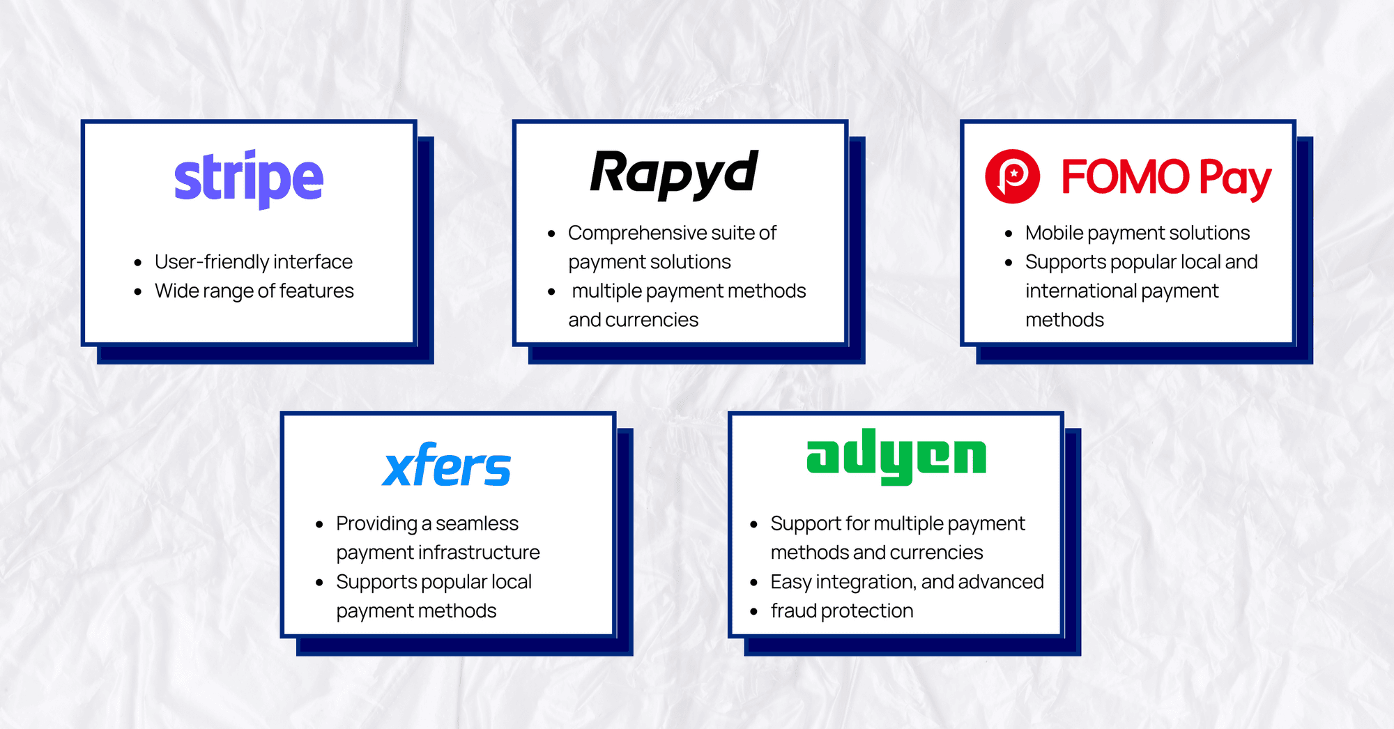 FOMO Pay: FOMO Pay specializes in mobile payment solutions and supports popular local and international payment methods. Its competitive pricing makes it a suitable choice for businesses looking to offer mobile payment options.