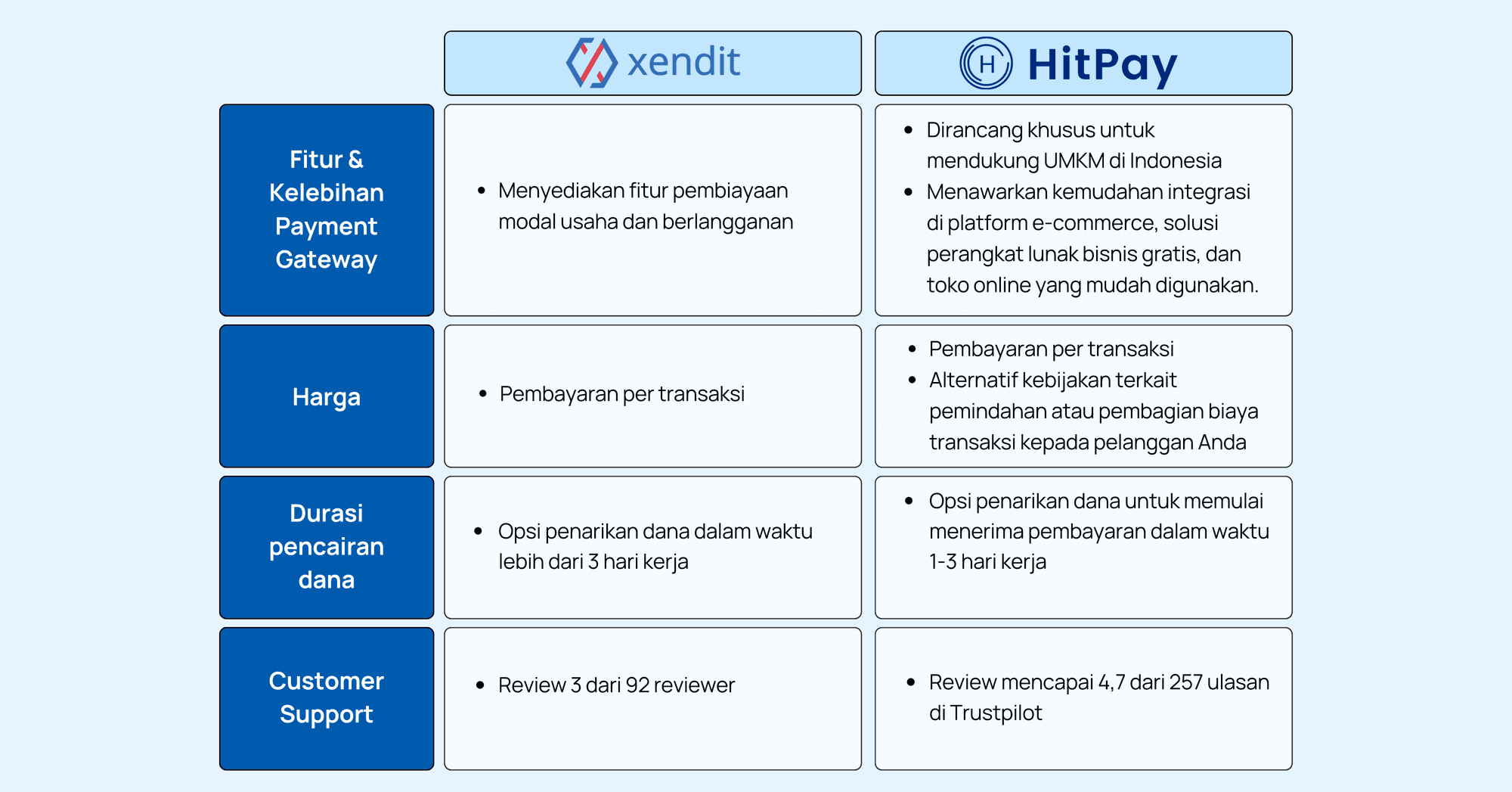 Payment Gateway Xendit dan Payment Gateway HitPay keduanya menyediakan solusi payment gateway guna mempermudah transaksi online/offline dengan integrasi metode pembayaran yang beragam. Xendit menonjolkan fitur pembiayaan modal usaha dan berlangganan, sementara HitPay, dirancang khusus untuk mendukung UMKM di Indonesia, menawarkan kemudahan integrasi di platform e-commerce, solusi perangkat lunak bisnis gratis, dan toko online yang mudah digunakan.
