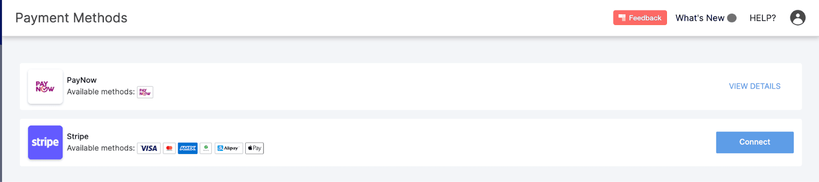 Set up your payment methods under Settings > Payment Methods. HitPay supports multiple payment methods with one integration. This includes popular e-commerce payment methods in Singapore like PayNow, credit cards and digital wallet apps like Apple Pay and GrabPay.