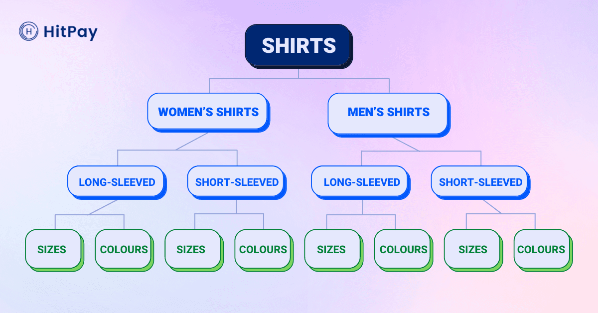 If you run a store selling shirts, categories can include the cutting (for women or men), and the type of shirt (long-sleeved or short-sleeved). Variants are more specific categories, for example, the sizes and colours that each product is available in.