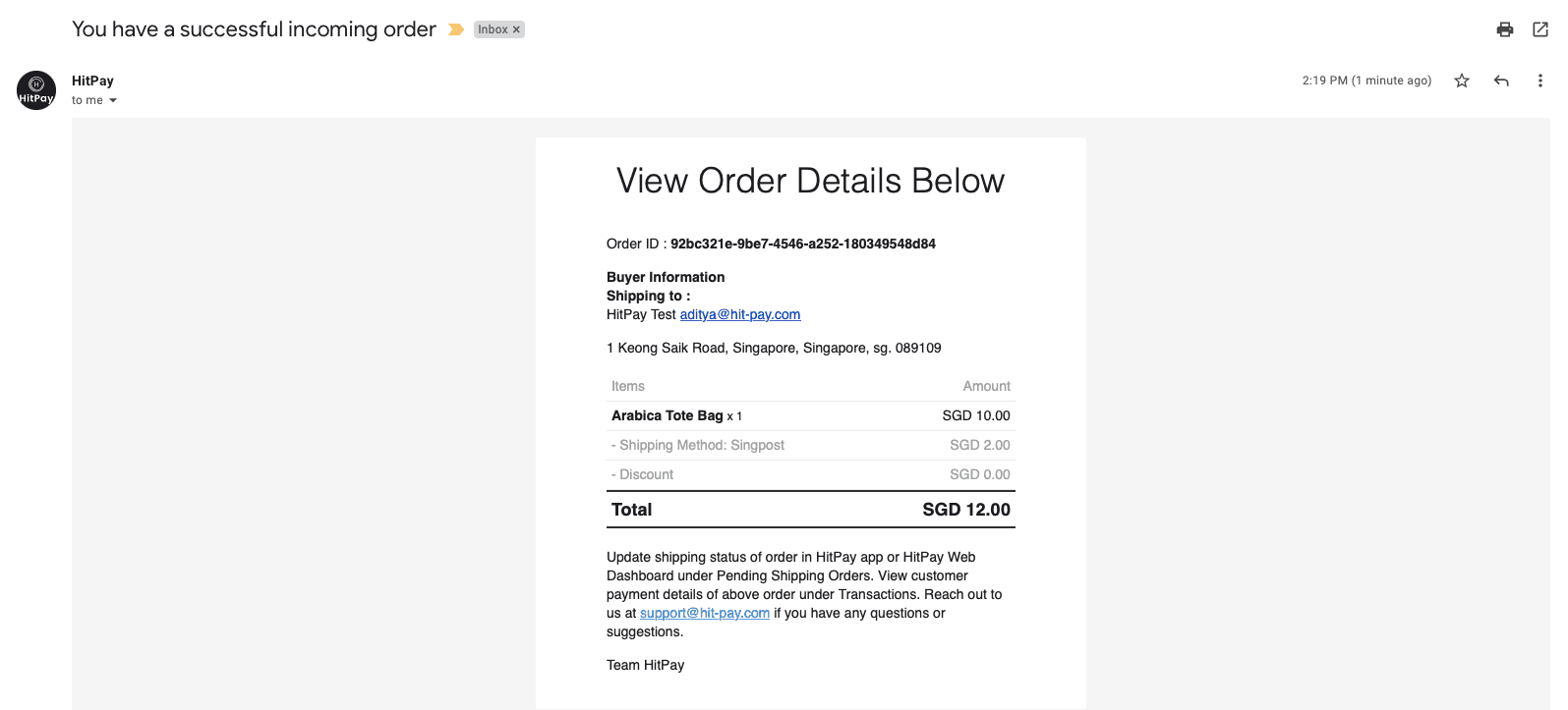 Once your customer has made an order, you’ll get an order confirmation notice via email and push notifications from the HitPay mobile app.