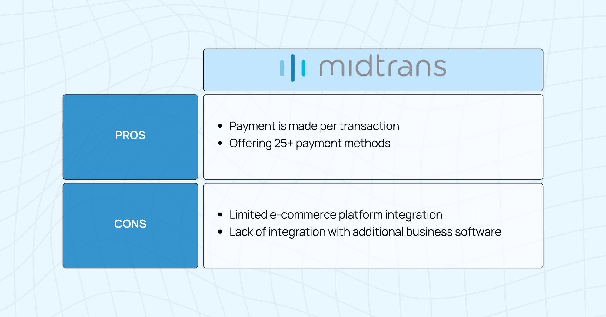 Midtrans is a digital payment platform affiliated with GoTo Financial. Offering more than 25 local payment methods, it presents a robust set of features, making it the preferred option for SMEs in Indonesia. Nevertheless, it's worth noting that Midtrans may not be accessible on all online stores and has limited integration with certain e-commerce plugins. Additionally, Midtrans isn't connected to accounting systems and doesn't feature supplementary business software.
