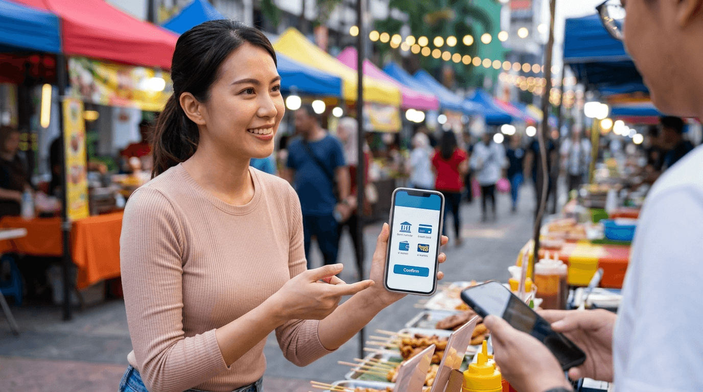 Retailers at bazaars and pasar malam: Display a DuitNow QR code at your stall for contactless payments, and share a payment link via WhatsApp for advance orders — no card terminal needed.