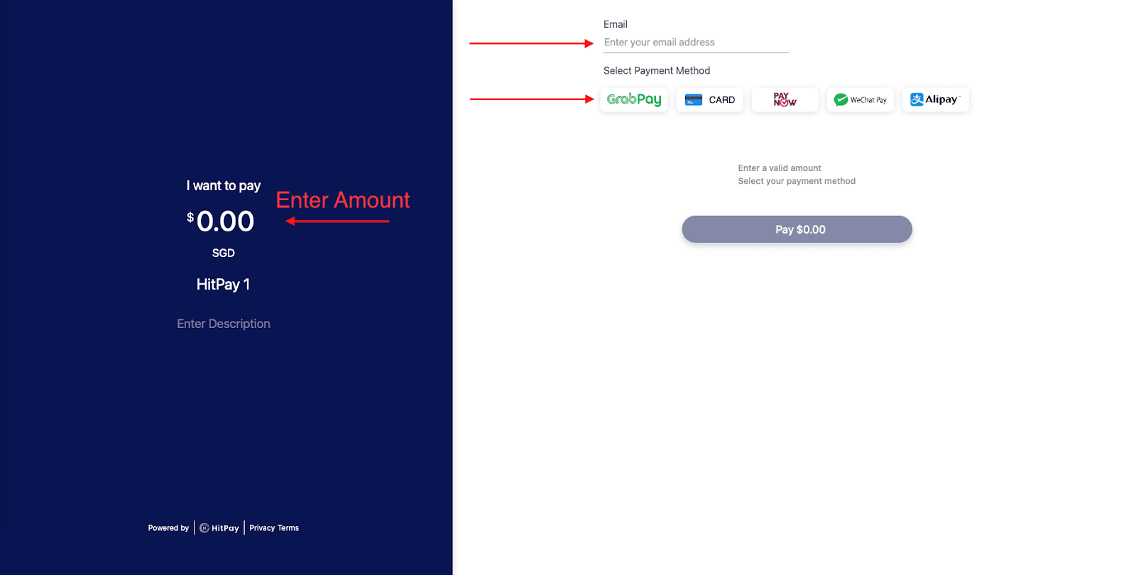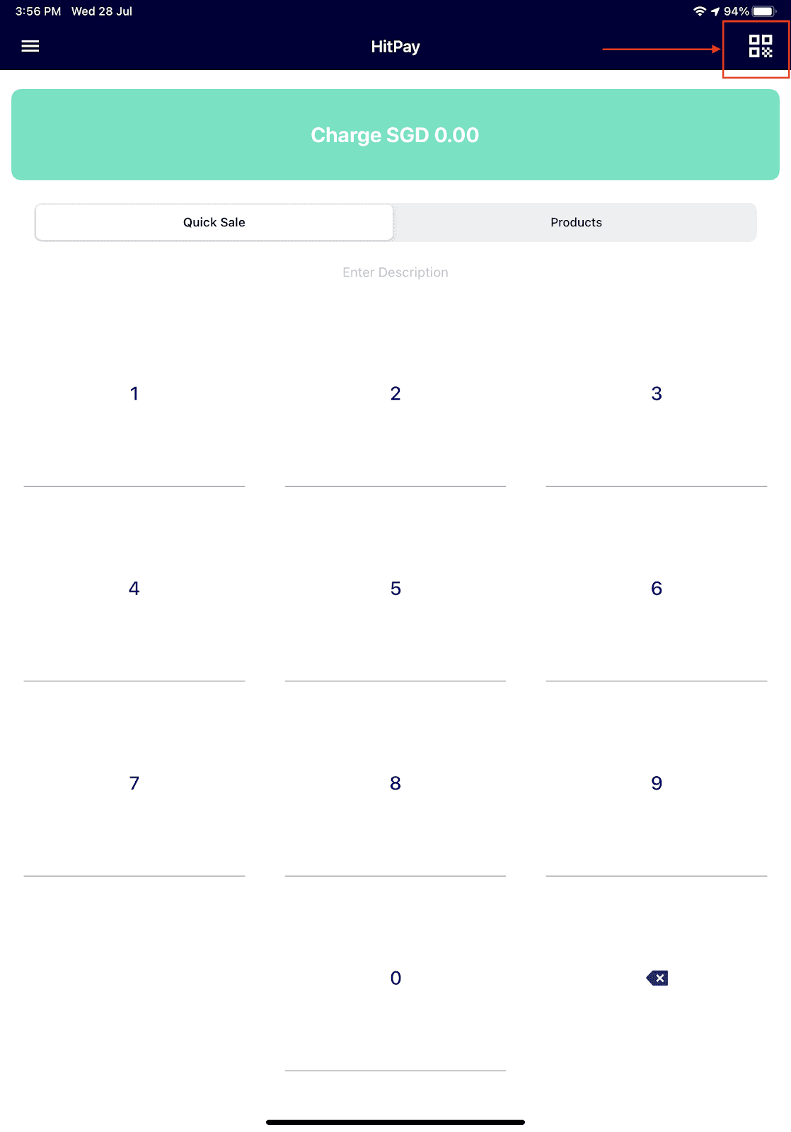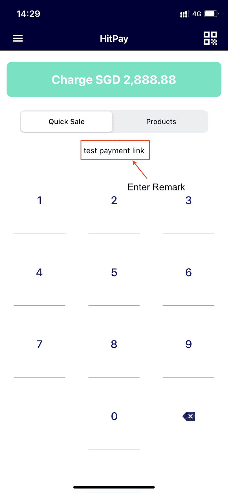 Step 1: Log in to the HitPay app. Enter the amount charged and an optional remark or description.