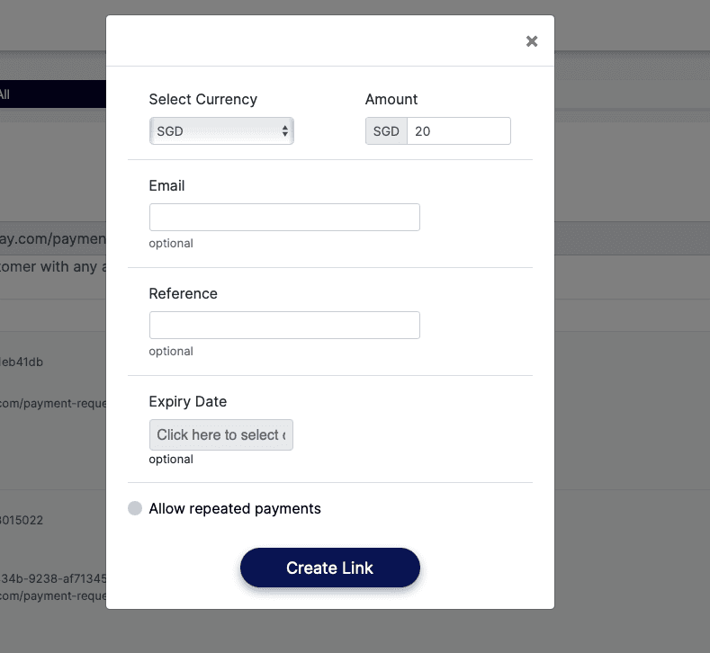 Step 3: Enter payment link details (currency, email, reference). You can even set an optional expiry date or allow repeated payments here.