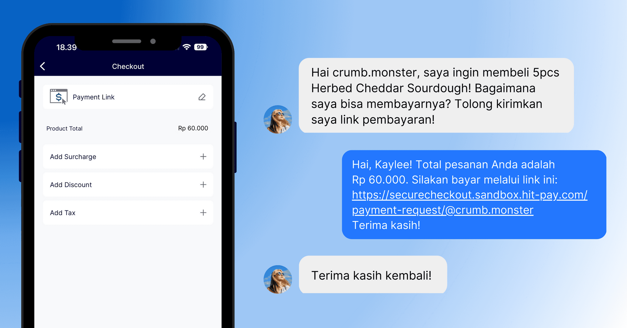 ✅ Payment link HitPay dapat digunakan di semua platform; mulai dari e-mail, pesan WhatsApp, atau bahkan DM Instagram. Butuh fitur lebih? Gunakan plug-in kami, bebas coding, untuk toko online Anda di platform e-commerce seperti Shopify, WooCommerce, dan Magento