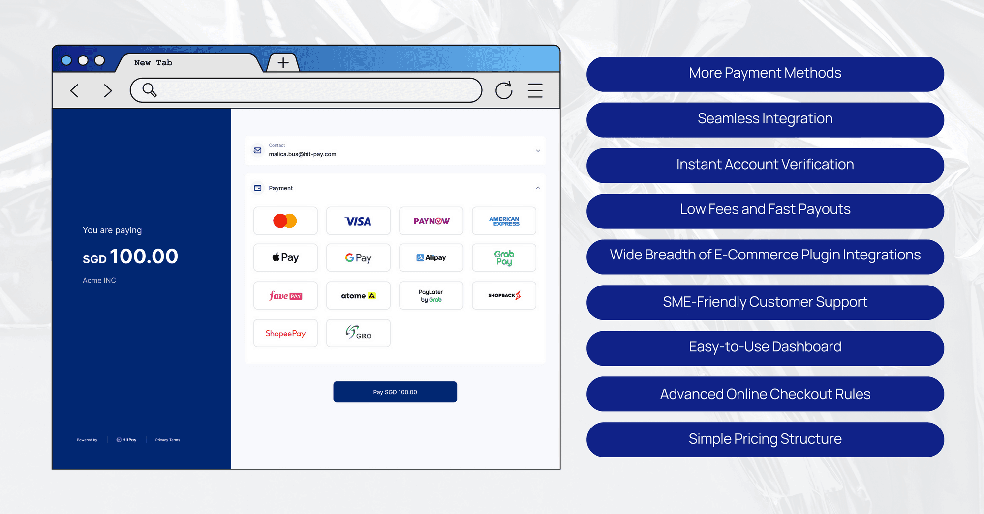 HitPay is a Singapore-based payment gateway that offers a wide range of features and benefits for small and medium-sized enterprises (SMEs). Some of its key features include seamless integration with popular e-commerce platforms, support for multiple payment methods, and competitive pricing. HitPay stands out among its competitors for its SME-friendly approach, easy-to-use dashboard, and advanced online checkout rules that help businesses save on payment processing fees and increase conversions.