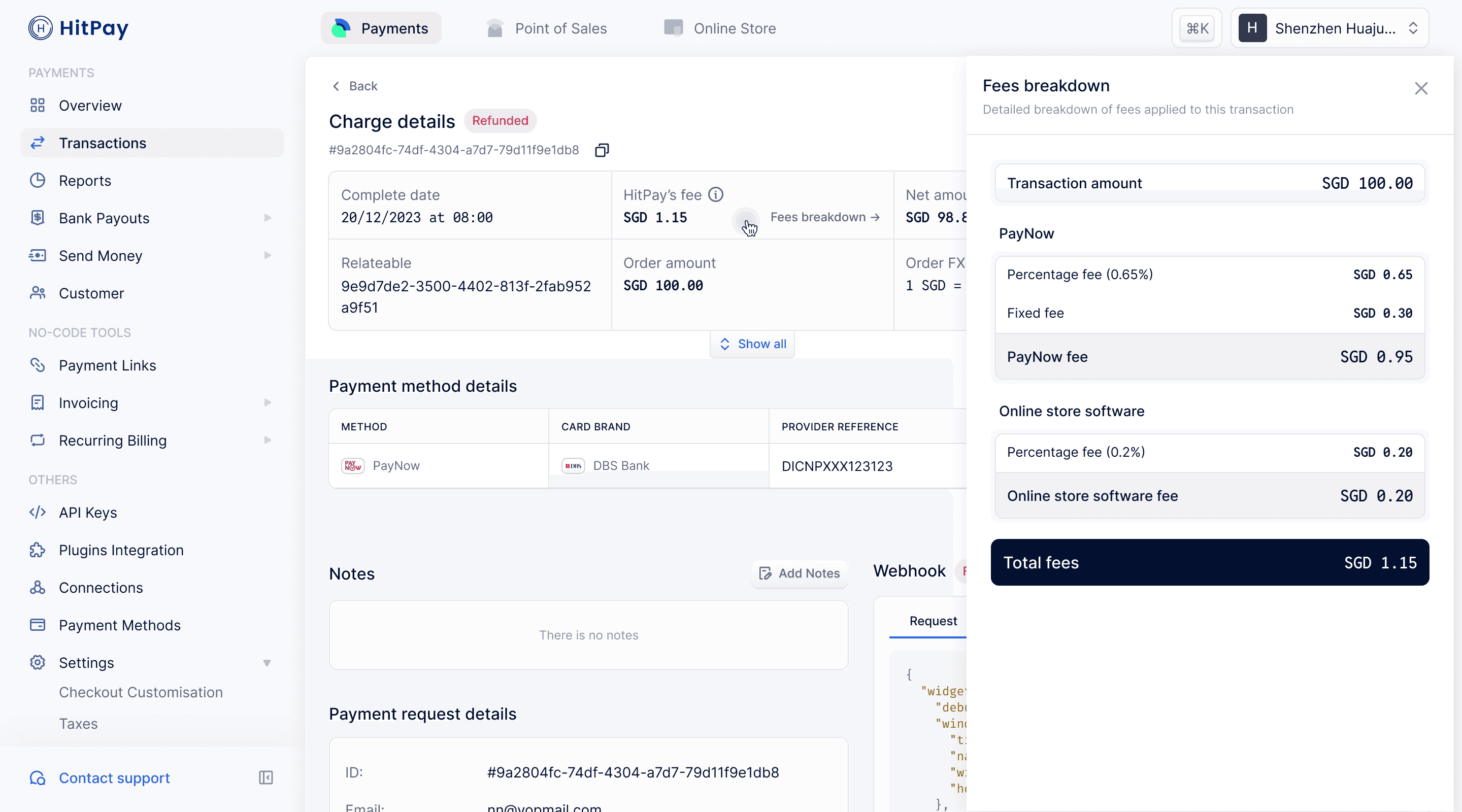 Navigate to any transaction in Payments > Transactions, and click the "Fees breakdown" link next to the HitPay fee amount. A panel will slide open with the full breakdown.