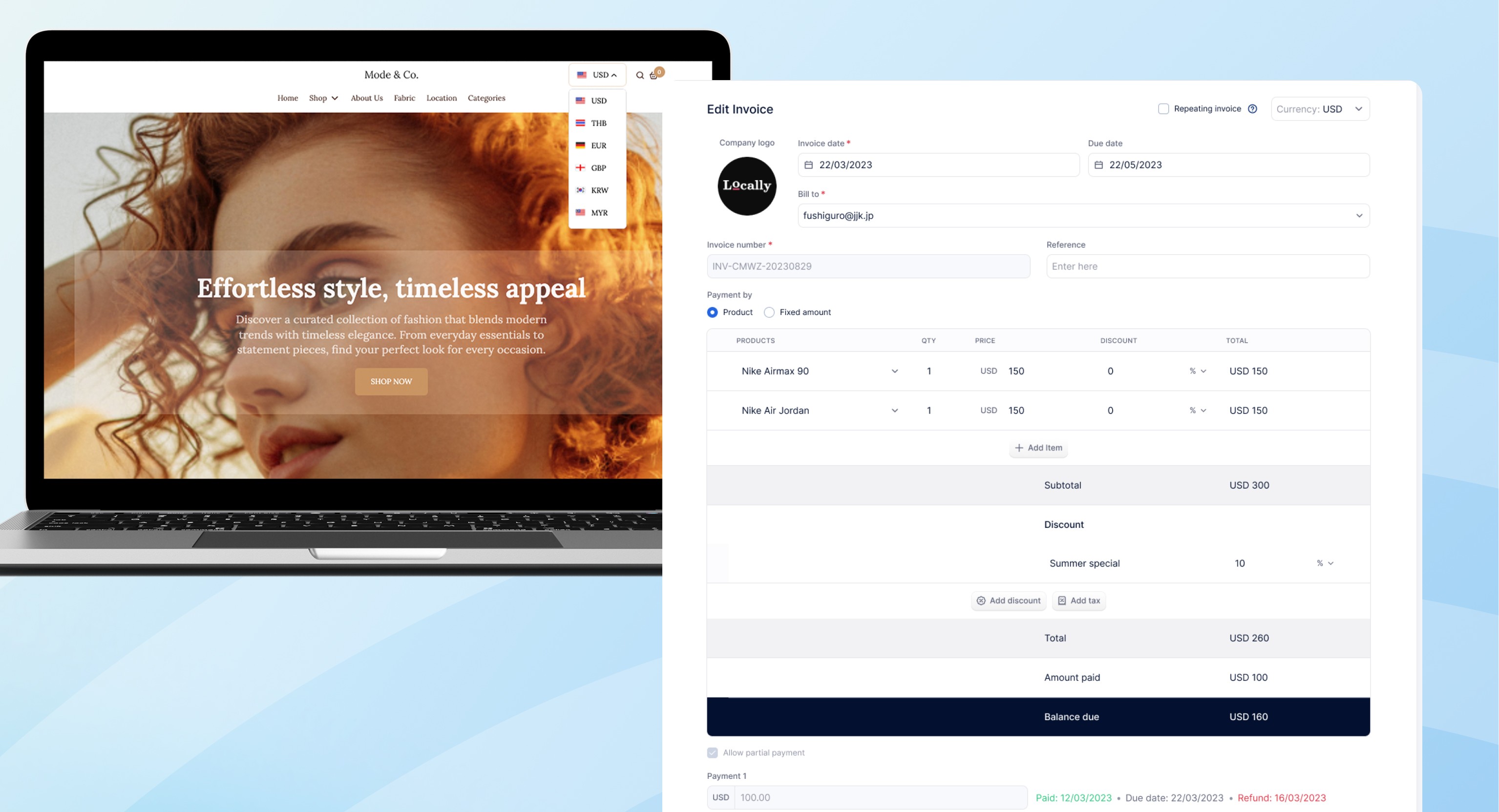 This release introduces multi-currency support for the online store, a new Mart theme designed for large product catalogs, and the ability to edit invoices even after payment
