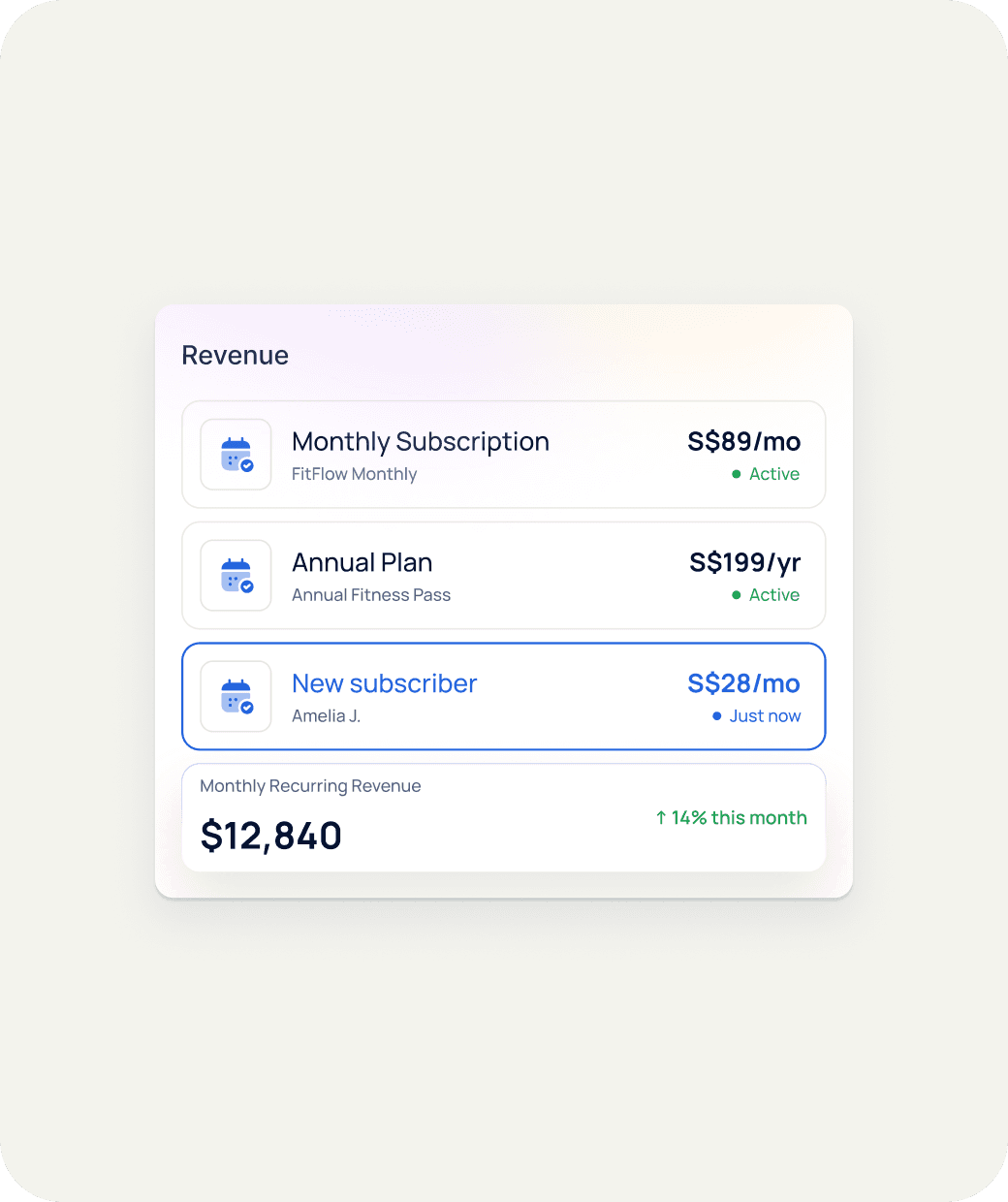 Set up subscription plans in under 30 minutes. Send members a sign-up payment link via WhatsApp — they enter their card or preferred payment details once and HitPay handles every subsequent charge. Migration works for members in Singapore, Malaysia, and the Philippines.